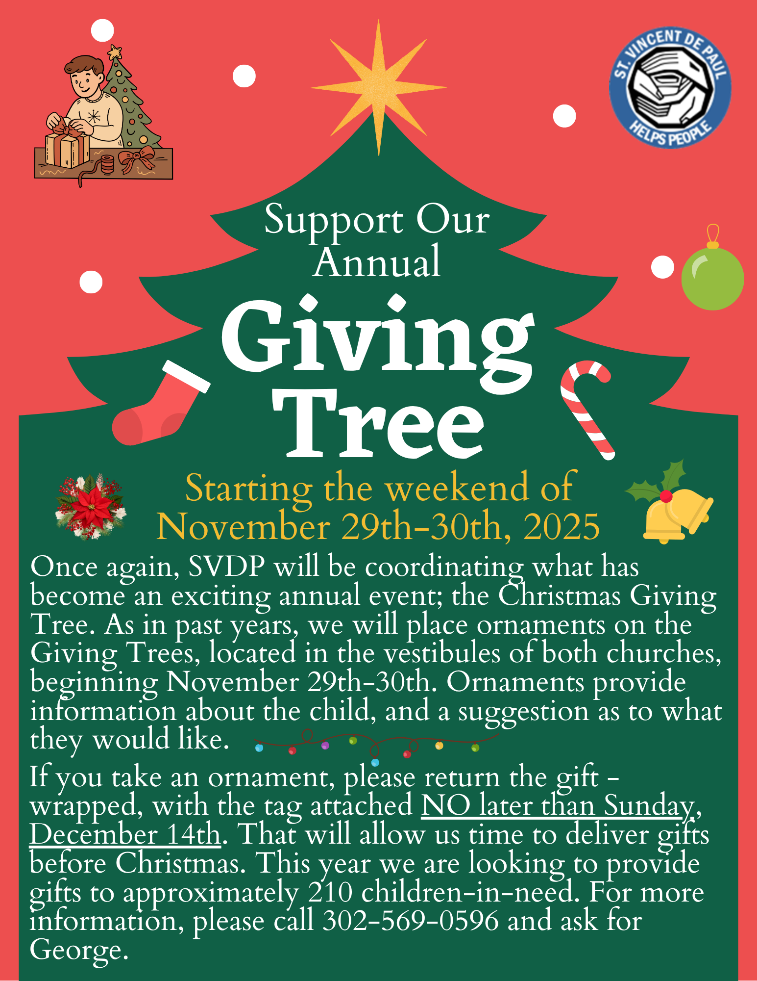 This final stretch offers a wonderful opportunity to make a tax-deductible contribution before December 31. Your donation may also qualify as part of your 2025 Required Minimum Distribution (RMD) from an IRA if directed as a Qualified Charitable Distribution (QCD). This allows individuals aged 70½ or older to donate directly to the parish from their IRA without increasing taxable income—a simple and tax-efficient way to give.